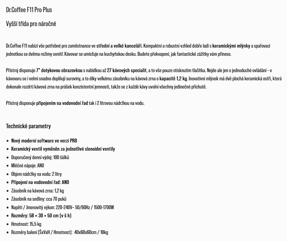 - Dr.Coffee F11 Pro Plus, 2 L nádržka a připojení na vodovod, 7" dotyková obrazovka